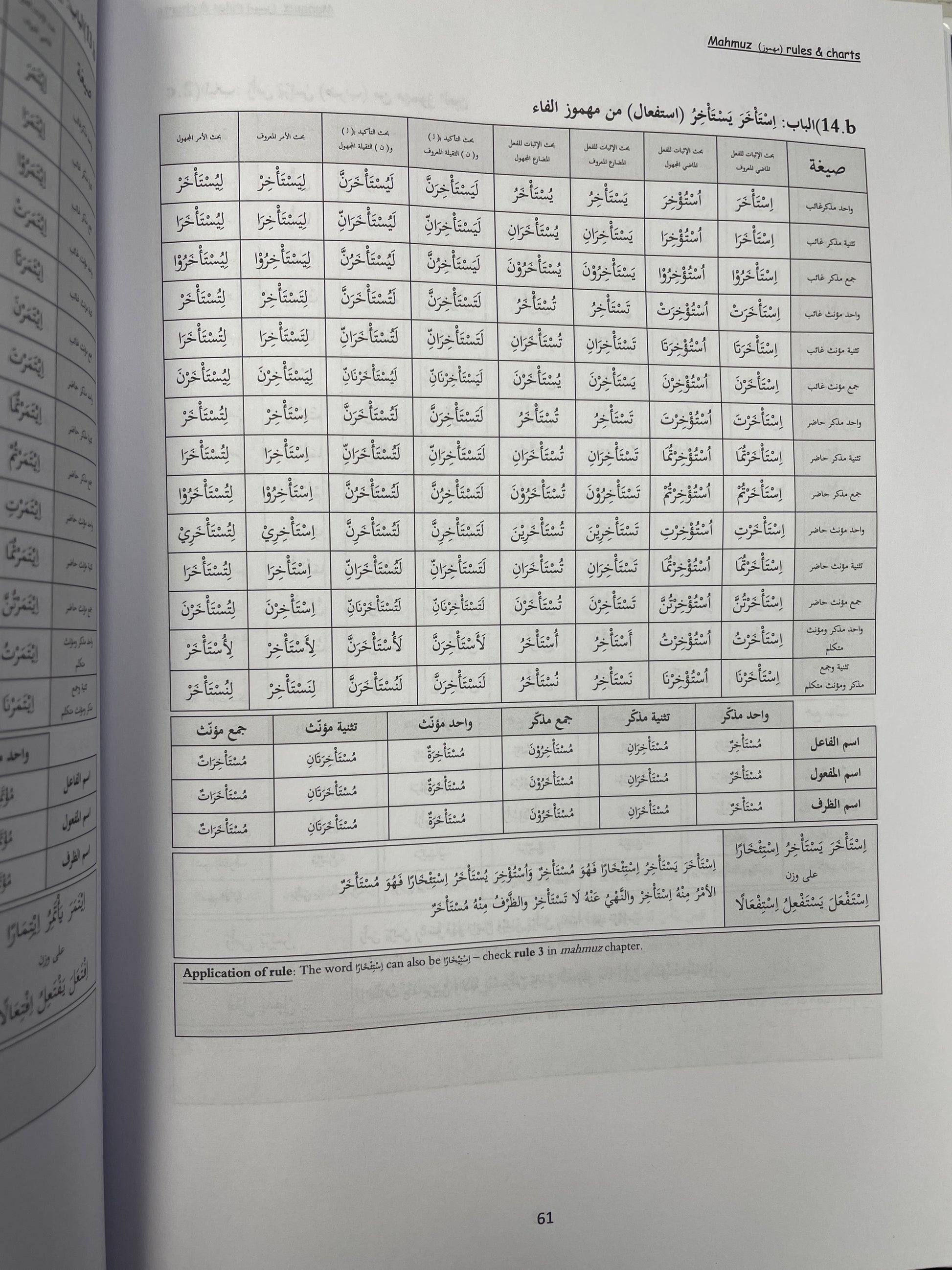 It introduces all the famous nineteen scales with their past tense, present/future tense, imperative, prohibitive, emphatic forms and much more. Furthermore, it builds onto the ‘small charts’ (sarf sagheer) for these words and also provides other words for practice.