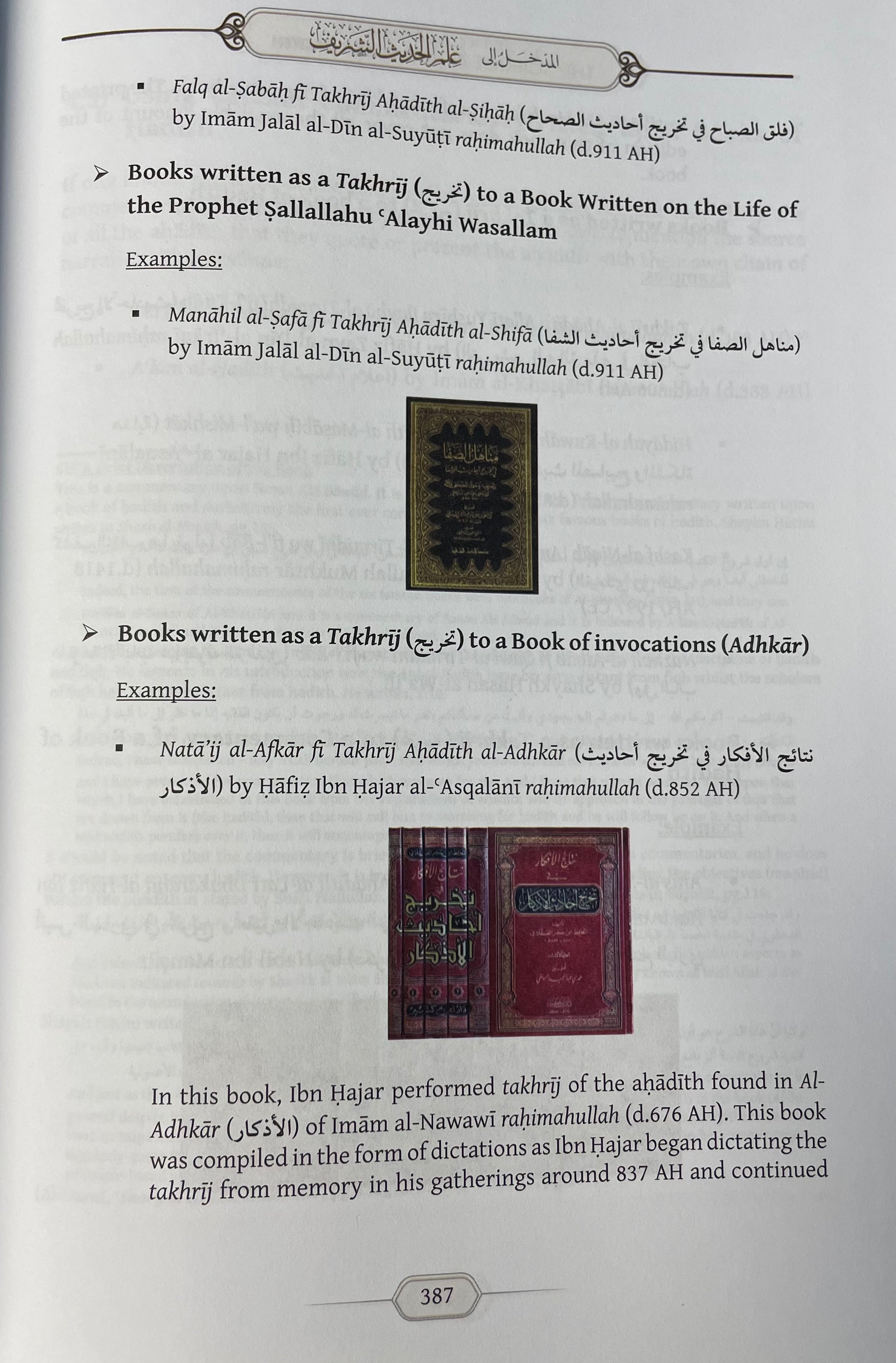 This book begins with an introduction to the codification of hadith, then an appreciation of the critical methodology of the muhaddithun, then a discussion on the common narrators of hadith, and then the entire process of takhrij is explained with a detailed introduction on many different books of hadith. The book contains the biographies of over 25 important scholars of hadith (including Ibn Hajar, Al-Iraqi, Al-Dhahabi, Al-Mizzi, Ibn Kathir, Ibn Sa’d, Al-Suyuti, Al-Bayhaqi, Ibn ‘Abd al-Barr, Al-Khatib, Abu Ya’la, Ibn Khuzaymah, Imam Ahmad, Al-Tabarani, Al-Bazzar, Mughlatay, Al-Hakim, Al-Zayla’i, Ibn al-Athir, Muhammad Ibn Sa’d, Al-Haythami, Ibn Abi Shaybah, Al-Harith Ibn Abi Usamah, Musaddad Ibn Musarhad, Al-Daruqutni).