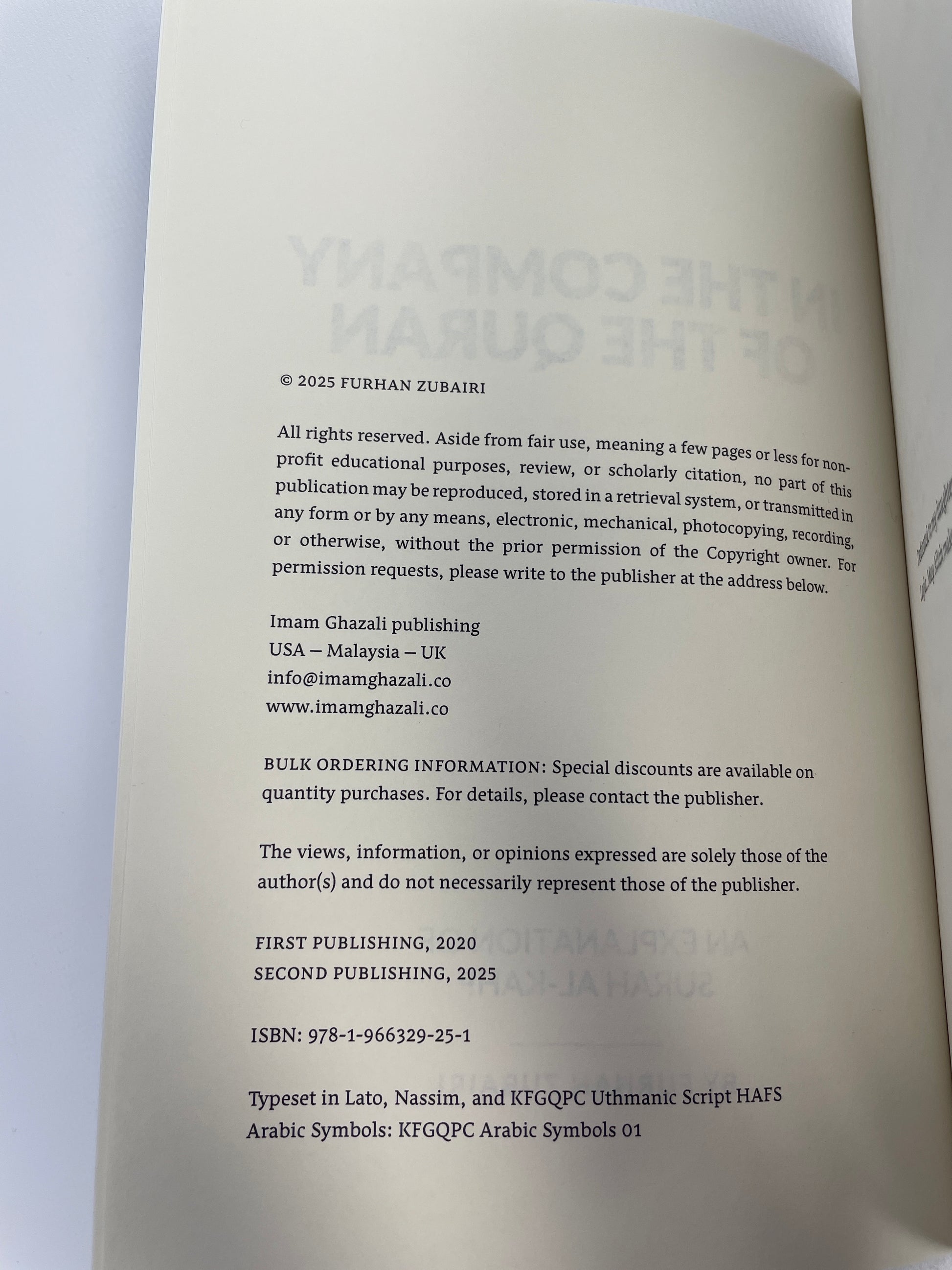 In the Company of the Quran – an Explanation of Sūrah al-Kahf by Shaykh Dr. Furhan Zubairi is the inaugural volume of what is intended to be a commentary on the entire Qur'an, to fulfill the author's life-long intention to complete a traditionally grounded modern tafsir written in English for a Western Muslim audience. This first volume discusses one of the Quran’s most frequently-read sūrahs. Drawing from classical scholarship, modern reflections, and a clear, concise writing style, Dr. Furhan illuminates the depth and beauty of Sūrah al-Kahf—making it accessible for readers of all backgrounds.