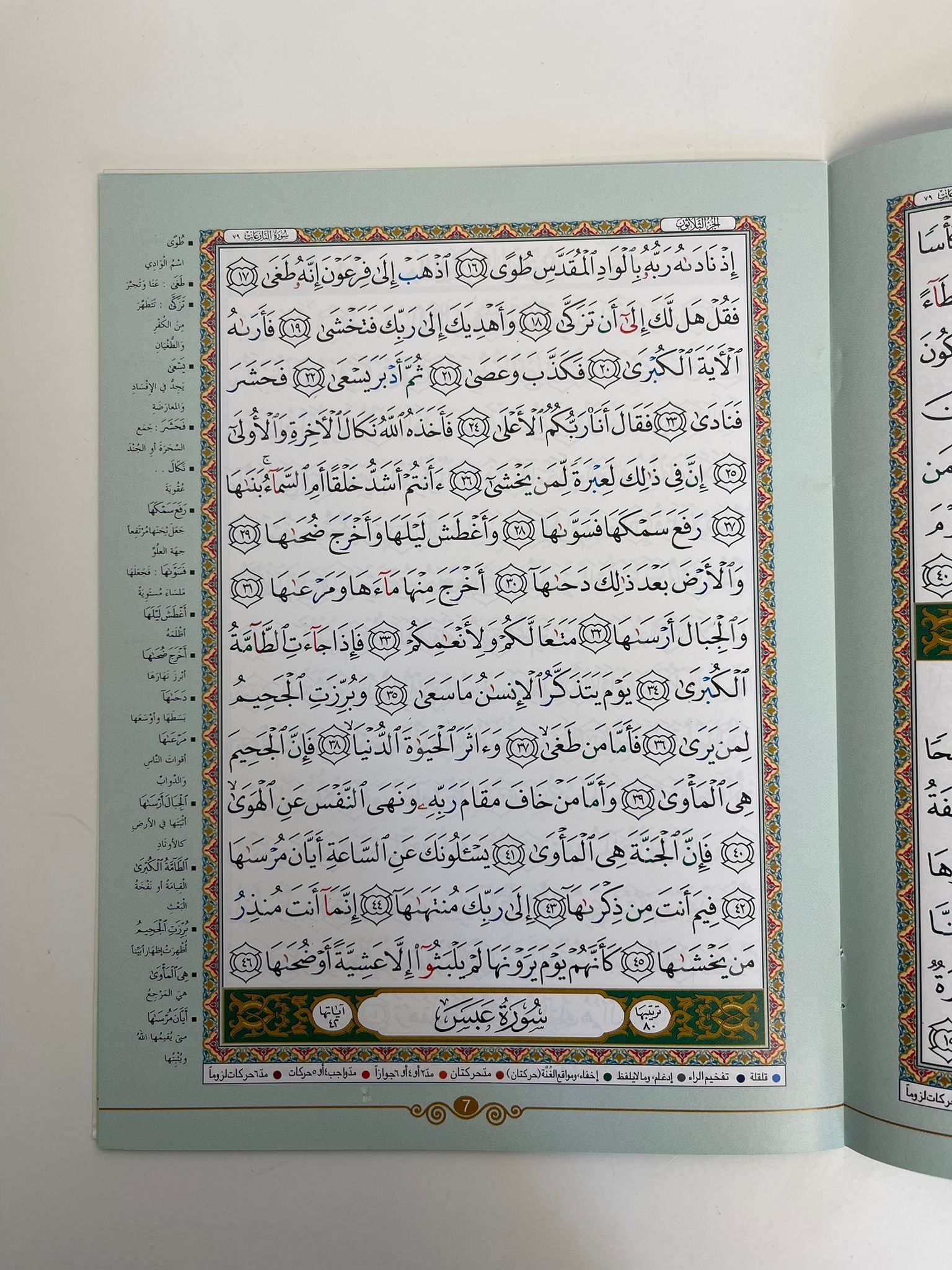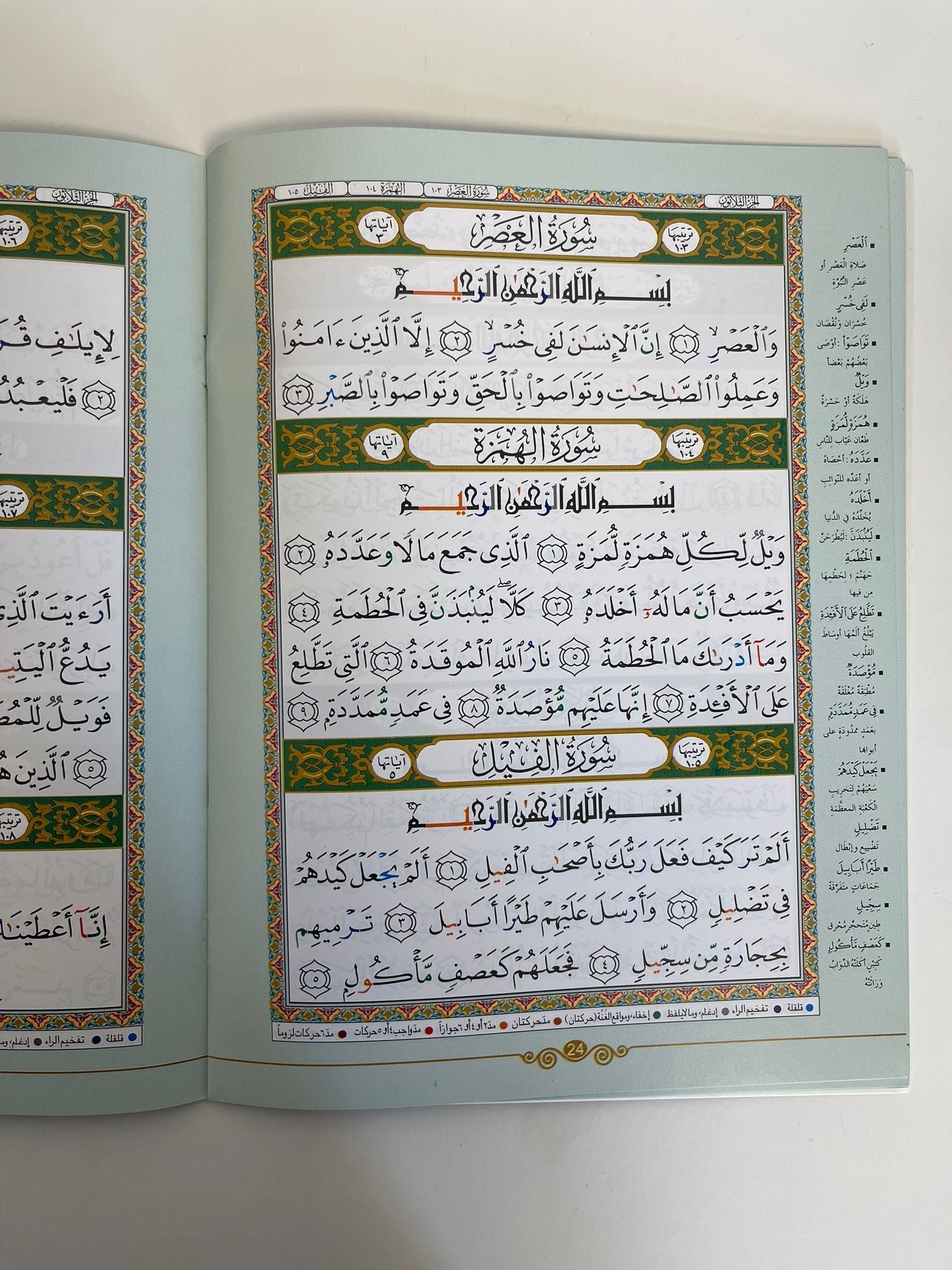 This Amma Part comes in the standard portrait form, with a nice glossy soft cover. Each page contains 15 lines as any standard Quran, with an interpretation of selected words placed on the margins on every page.