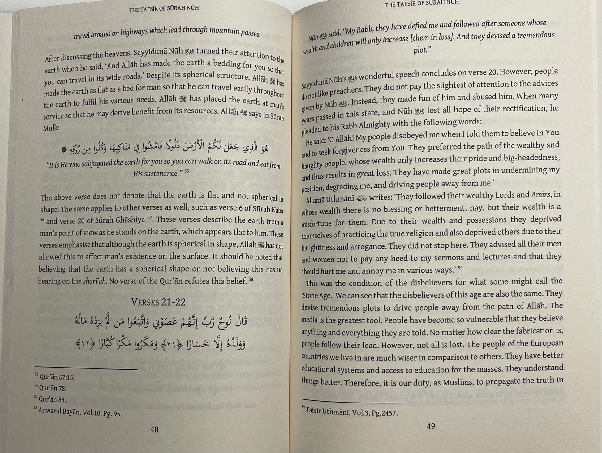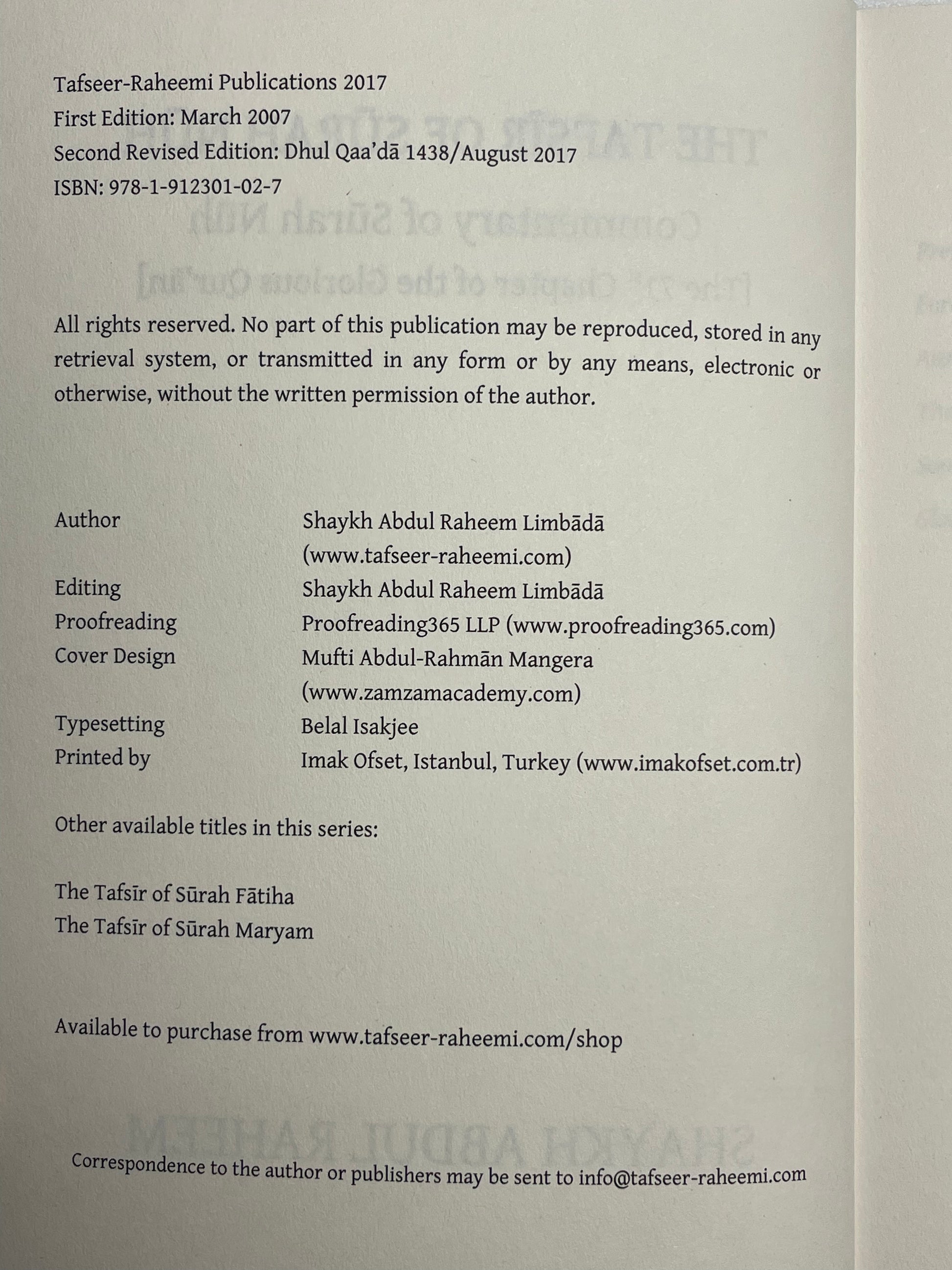The success in both worlds for those who follow the noble Prophets and the severity and calamity upon those who reject them, is repeatedly heralded within the Holy Qur’ān. The most significant episode of these is the one of the Prophet Nūh u and his community. The honourable Shaykh Abdul Raheem [Hāfizahullāh], prior to the present work, wrote a work of Qur’ānic exegesis on Sūrah Yūsuf, in English, which was exceedingly well received. Consequently, this raised his self-confidence and a further work of Qur’ānic exegesis on Sūrah Nūh has materialised.